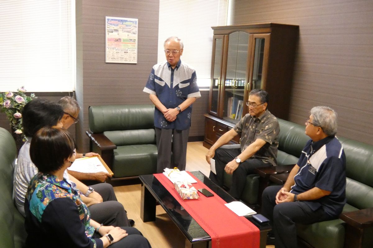 7月30日に開催されたチャリティゴルフコンペで集まった寄付金と電管協の寄付あわせて70万円を、仲田会長から大城理事長へ贈呈した。
